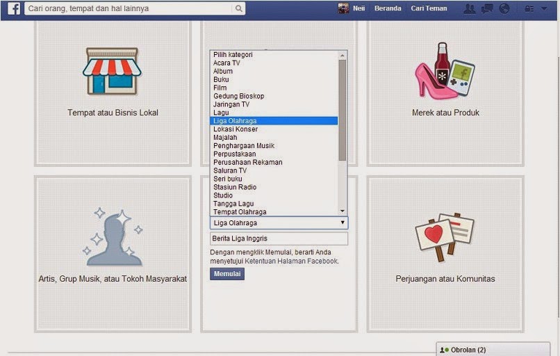 3) Lalu Pilih Kategory Yang Di Inginkan. Misal Liga Olahraga, Lalu Tulis Nama Halaman Anda. Kemudian Klik Memulai